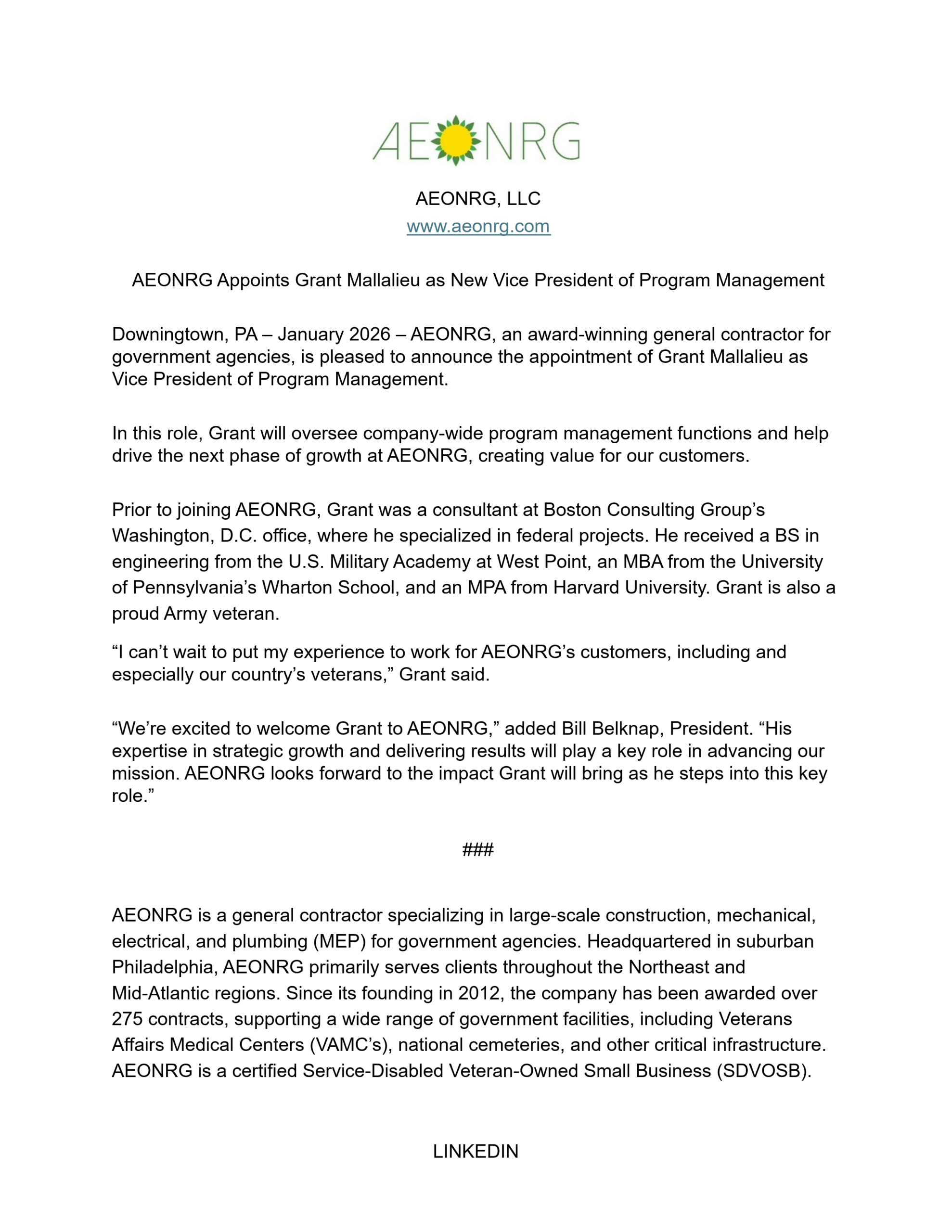 - AEONRG Named SBA Eastern PA Veteran Small Business of the Year